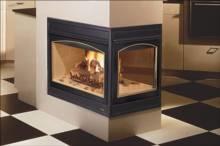 Left- or right-facing two-sided corner configuration provides an exquisite, active fire and heat-circulating coziness.