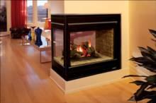 Three-sided peninsula configuration offers a beautiful, natural-looking fire and warm circulating heat with the same appearance as the direct-vent version in a more ecumenical B-vent system.